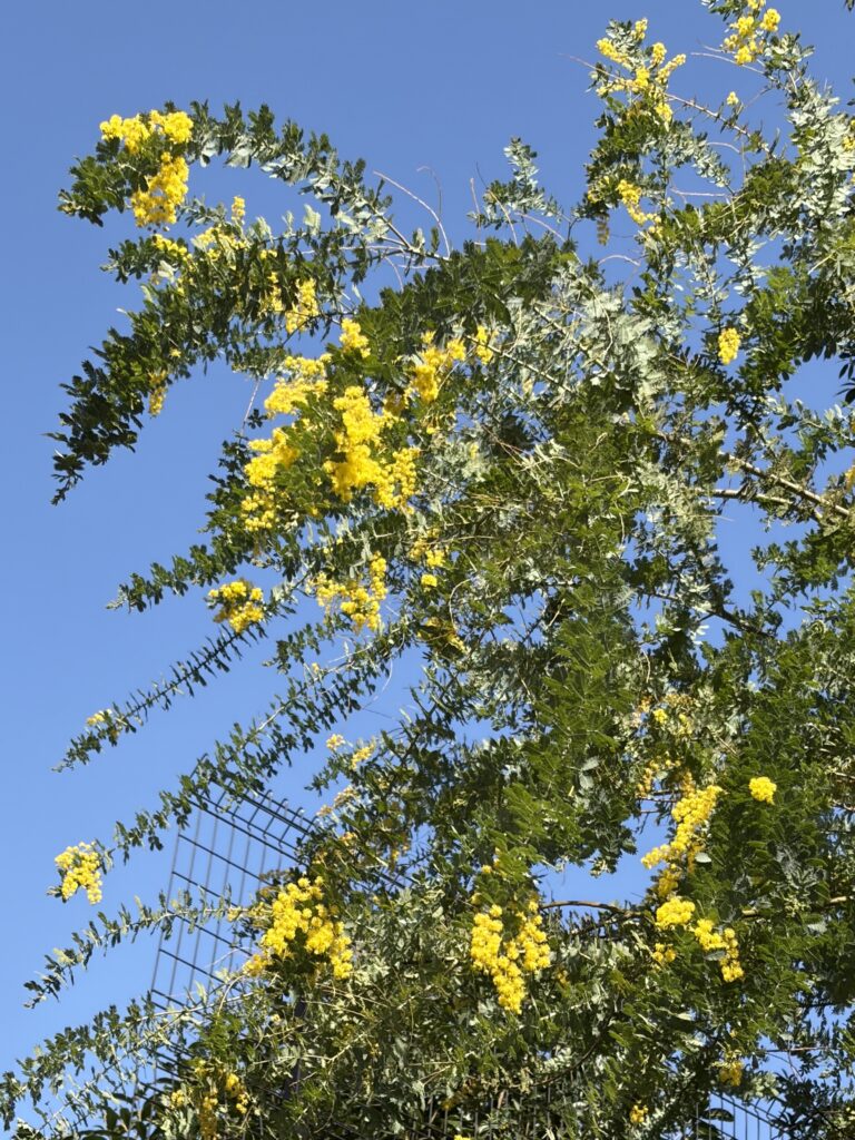 見上げれば、ミモザが澄み切った青空を背に金色の房を揺らし、黄色いサンシュユも沢山の花を付けていた。