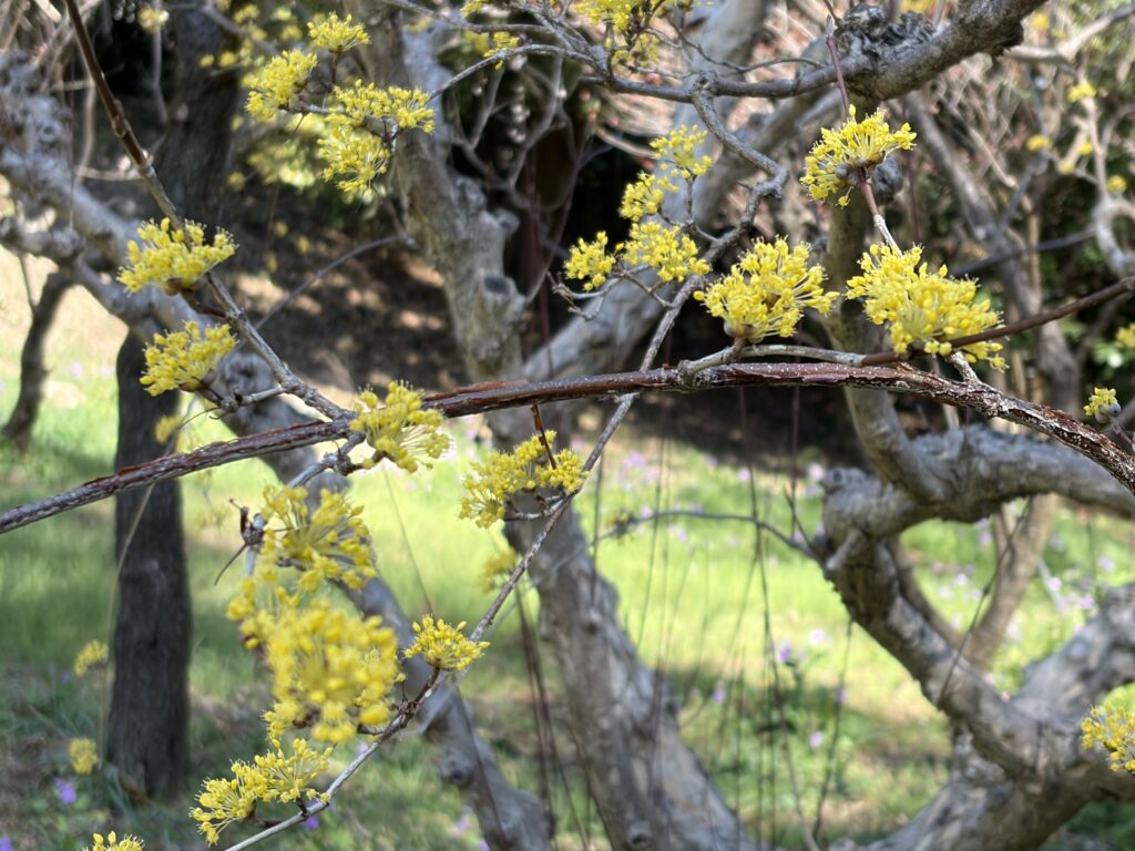 「サンシュユ」。昔、中国から渡ってきた木で、赤い実は漢方薬にも用いられるという。早春、葉が開く前に黄色い小さな花の集まりが枝に咲く——。